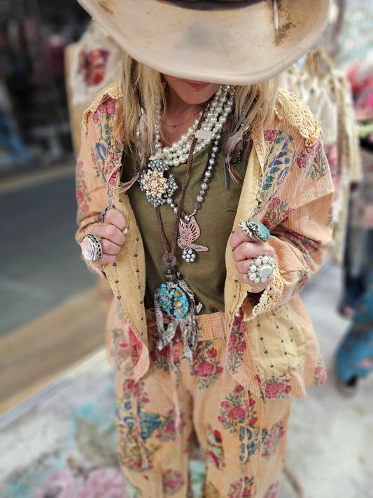 Stitched, jeweled, patched, and sewn by hand. Be the gorgeous person in the room wearing A Rare Bird!