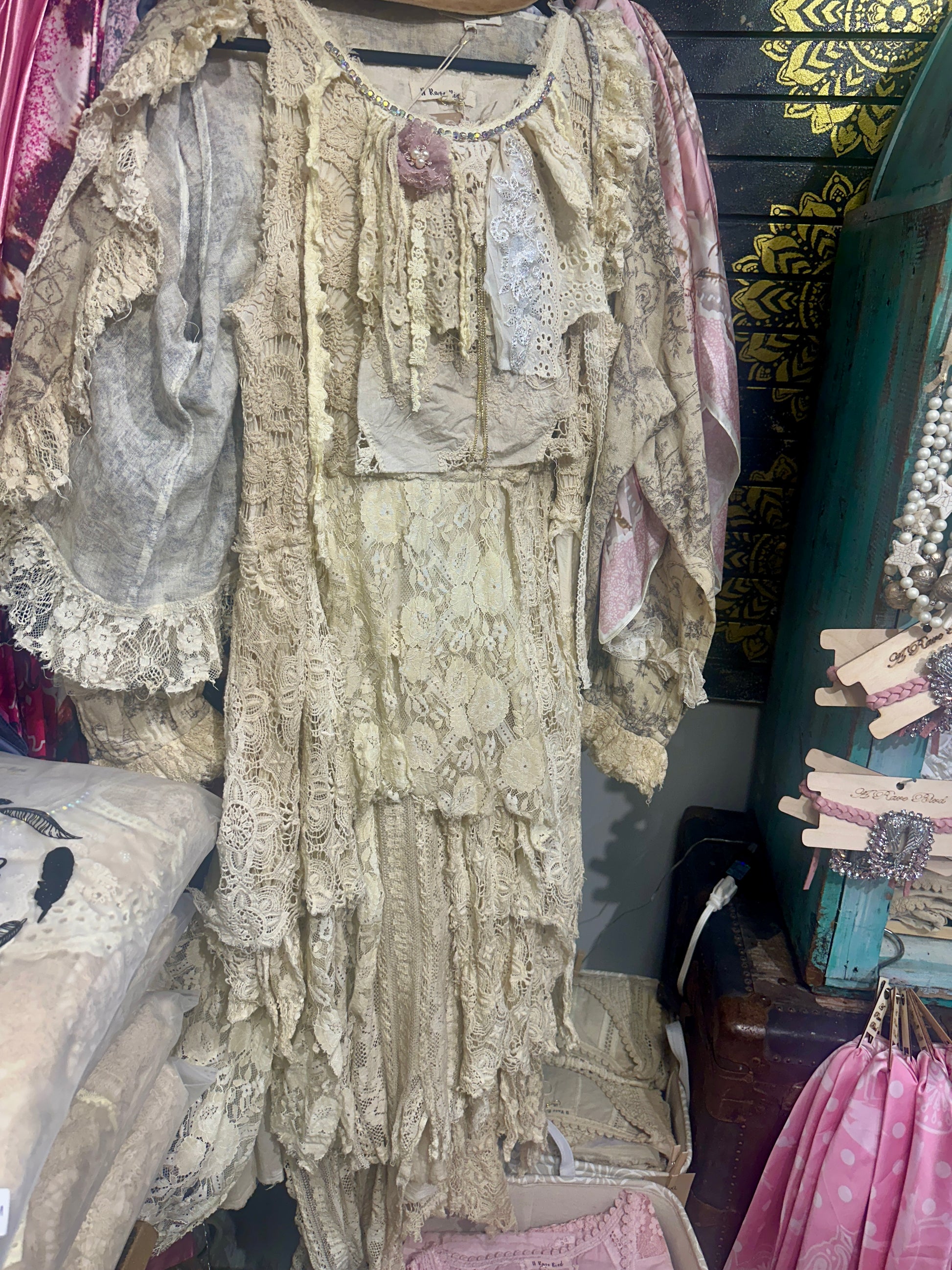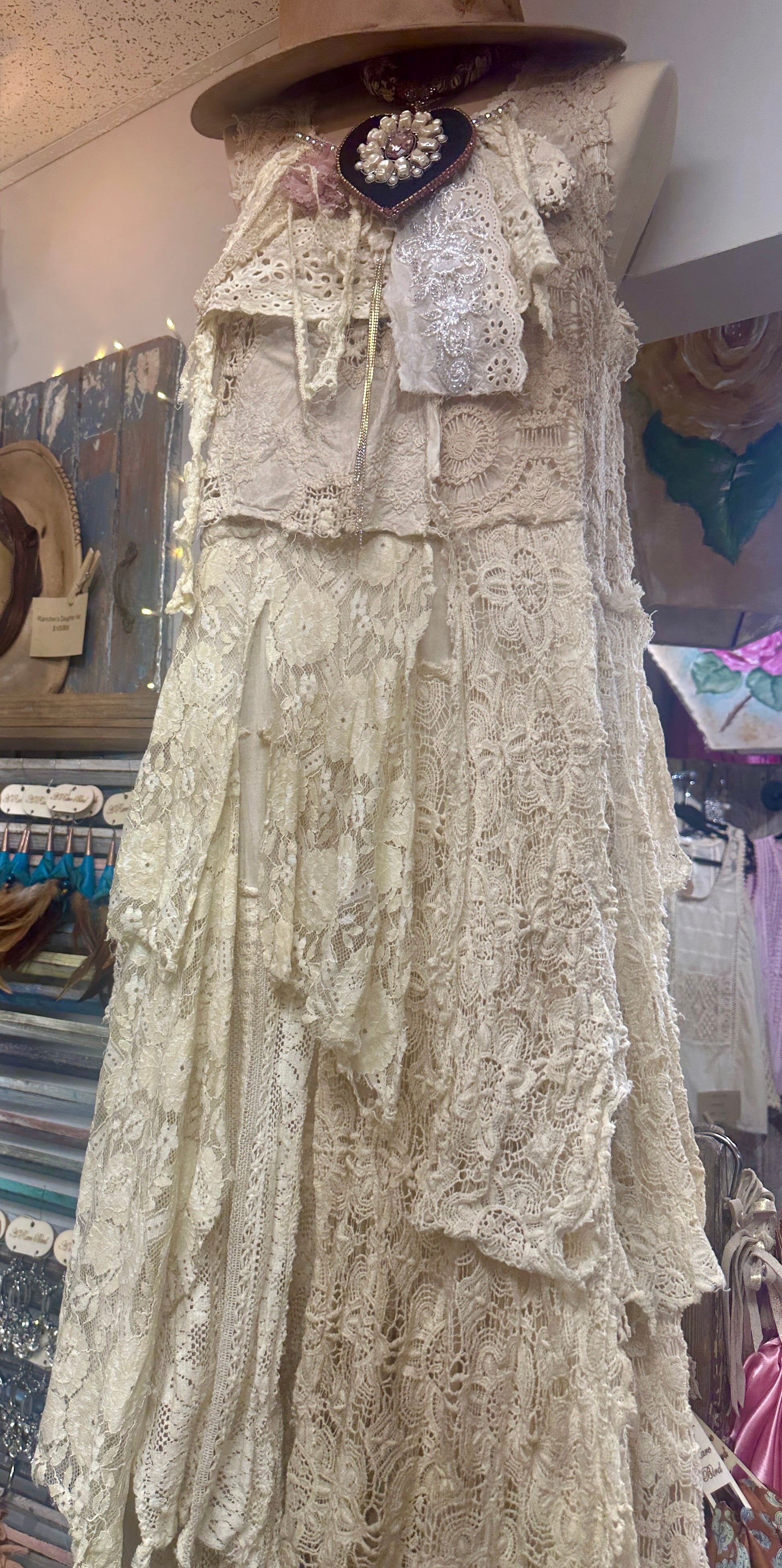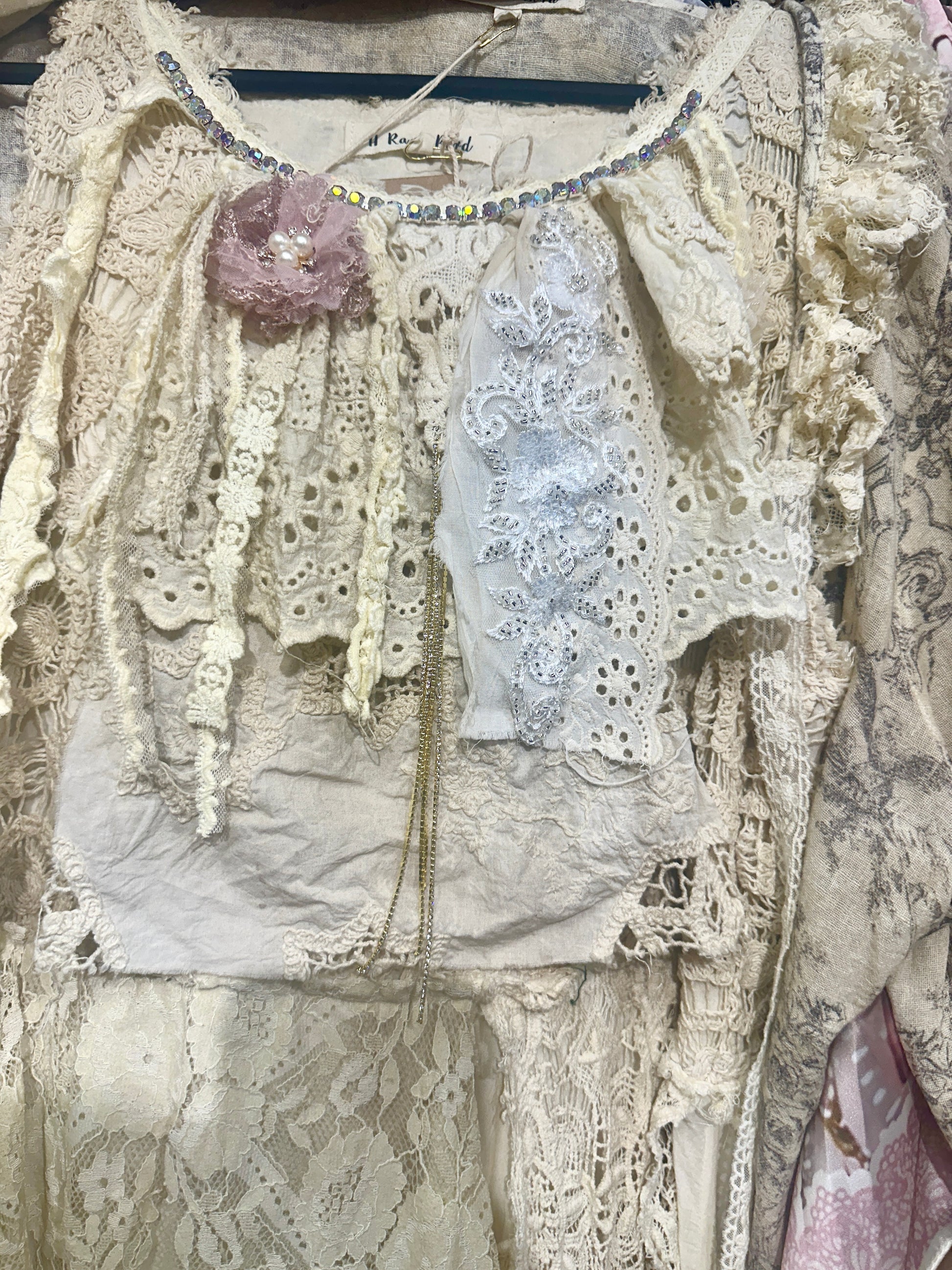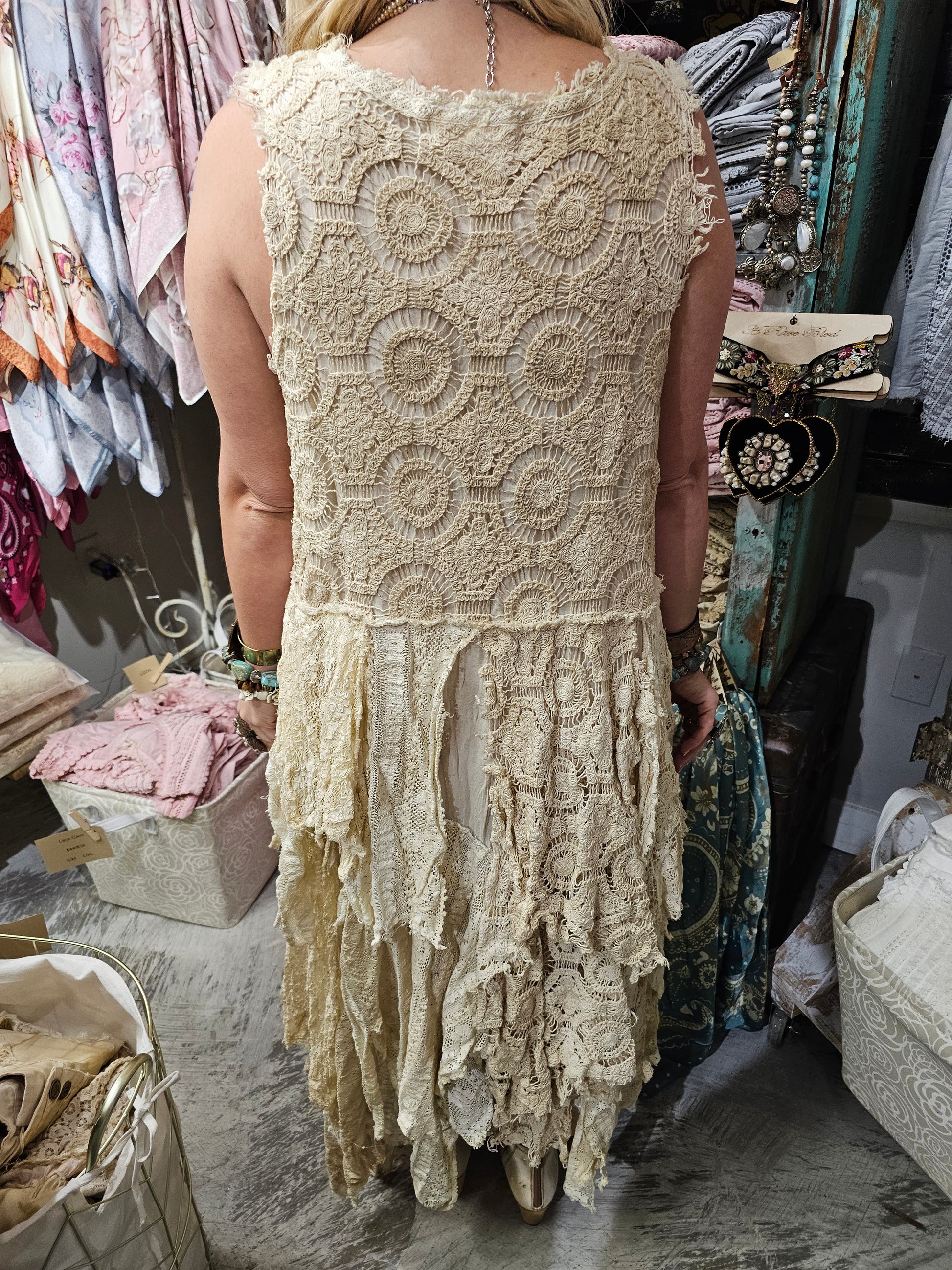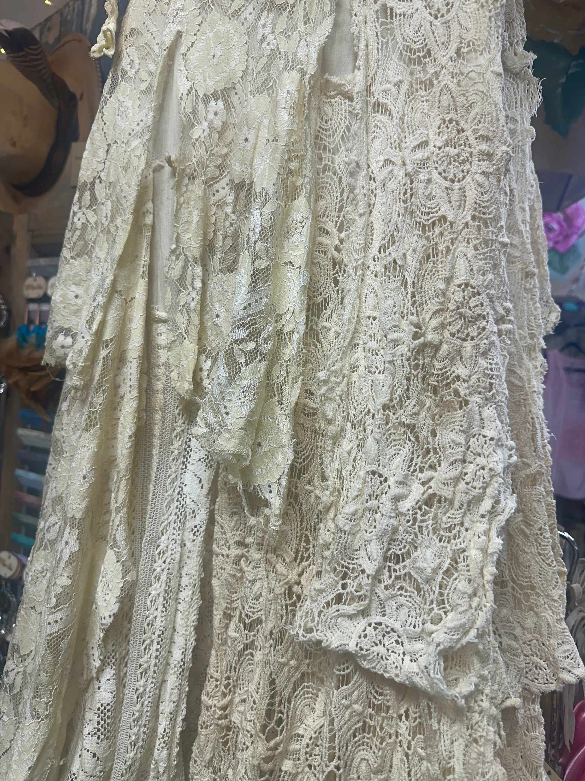 All vintage lace hand sewn. Each one of a kind piece. Extra long for the tall gals but just take scissors and cut what you don't want! All uneven and fun! Vintage neck piece sewn into the neck with pearls and fun. Pairs well with the toile top.