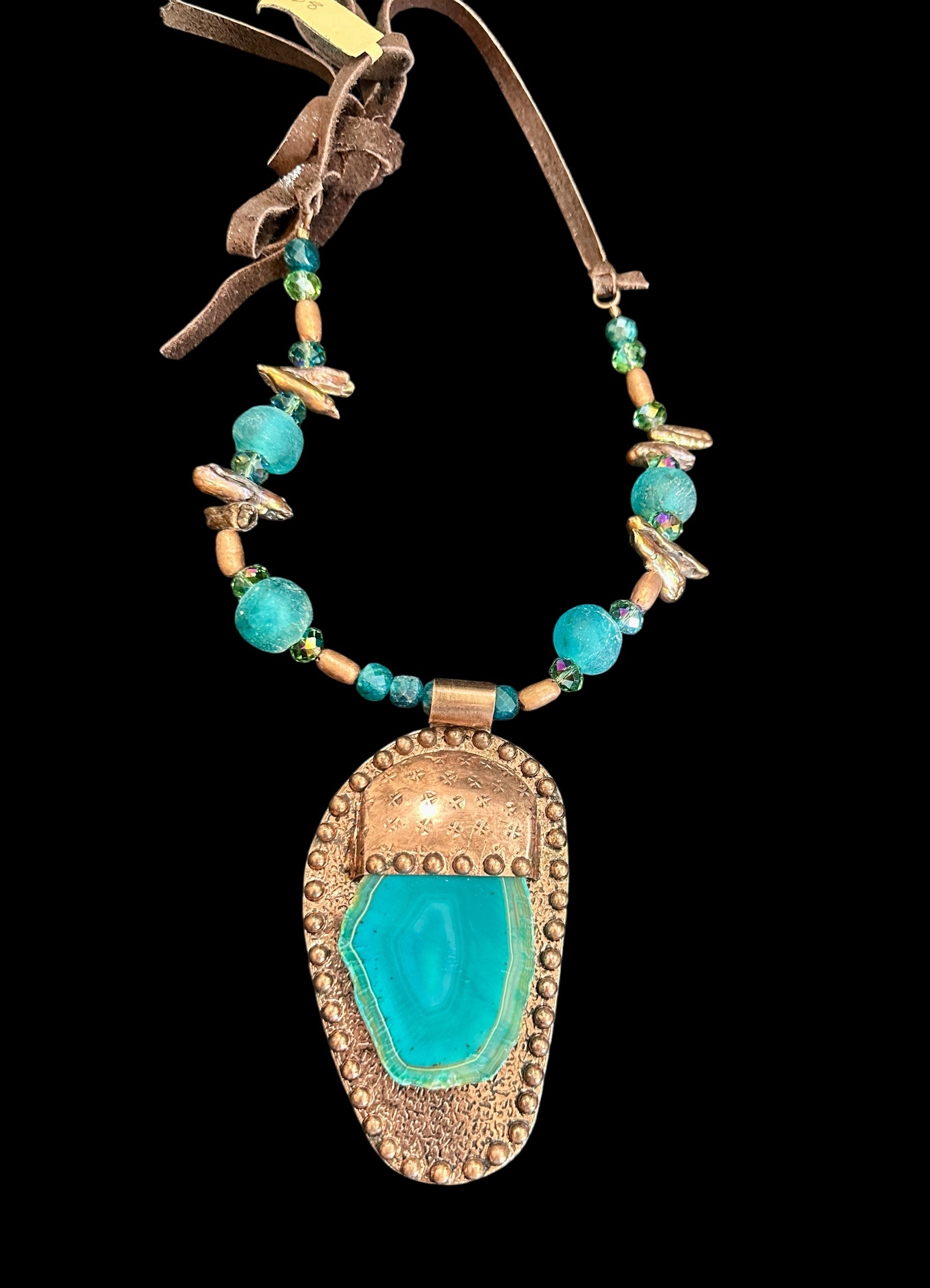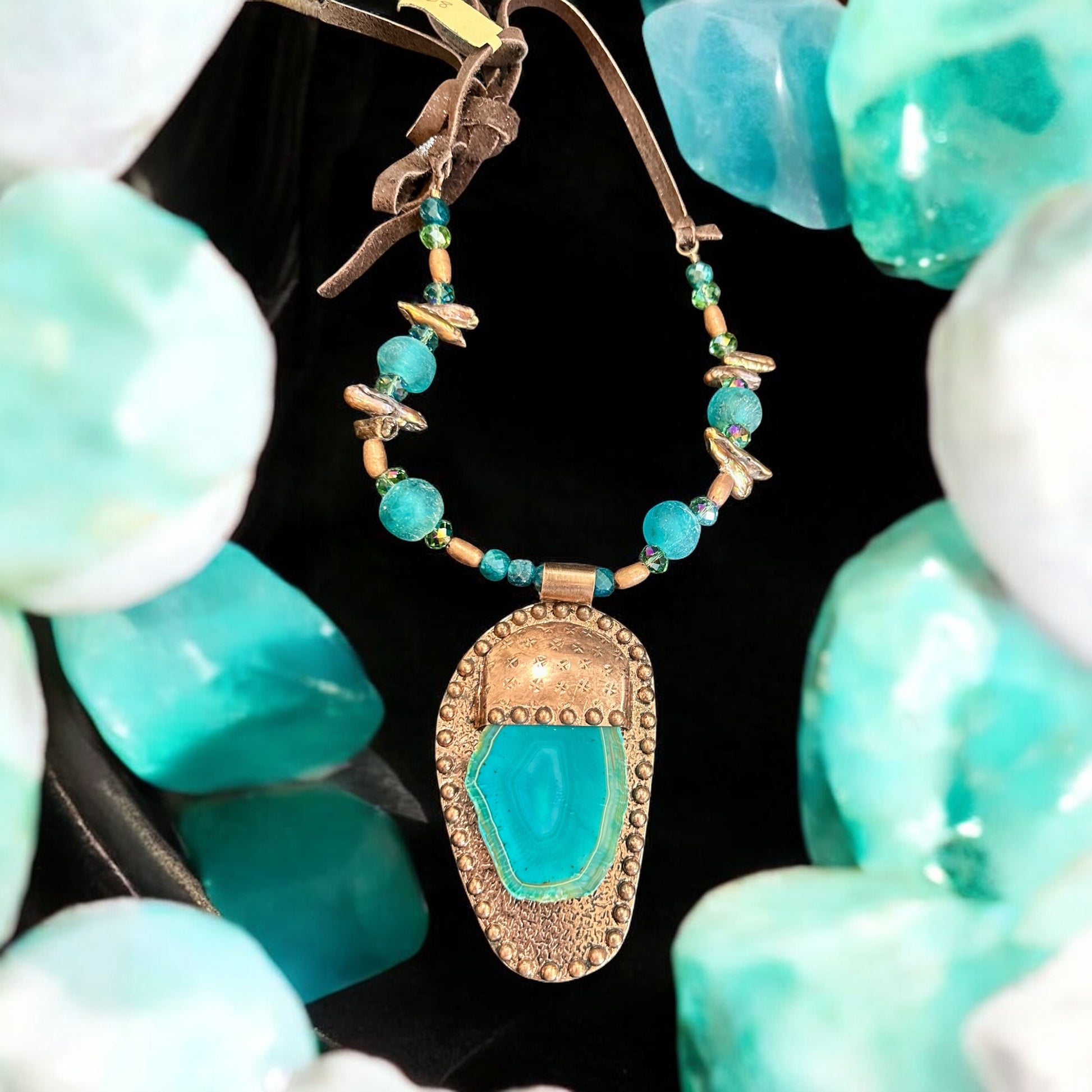 This large gorgeous agate piece is framed by a copper pocket and base. Adjustable, this piece is stunning art.