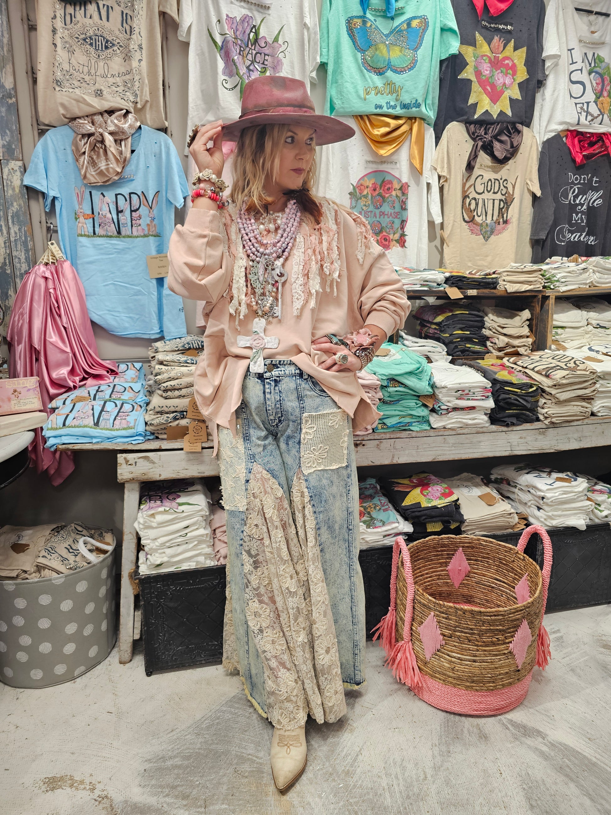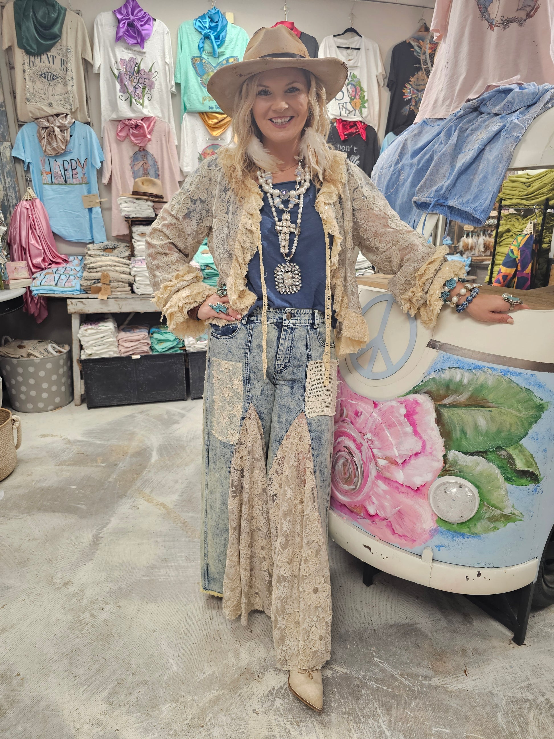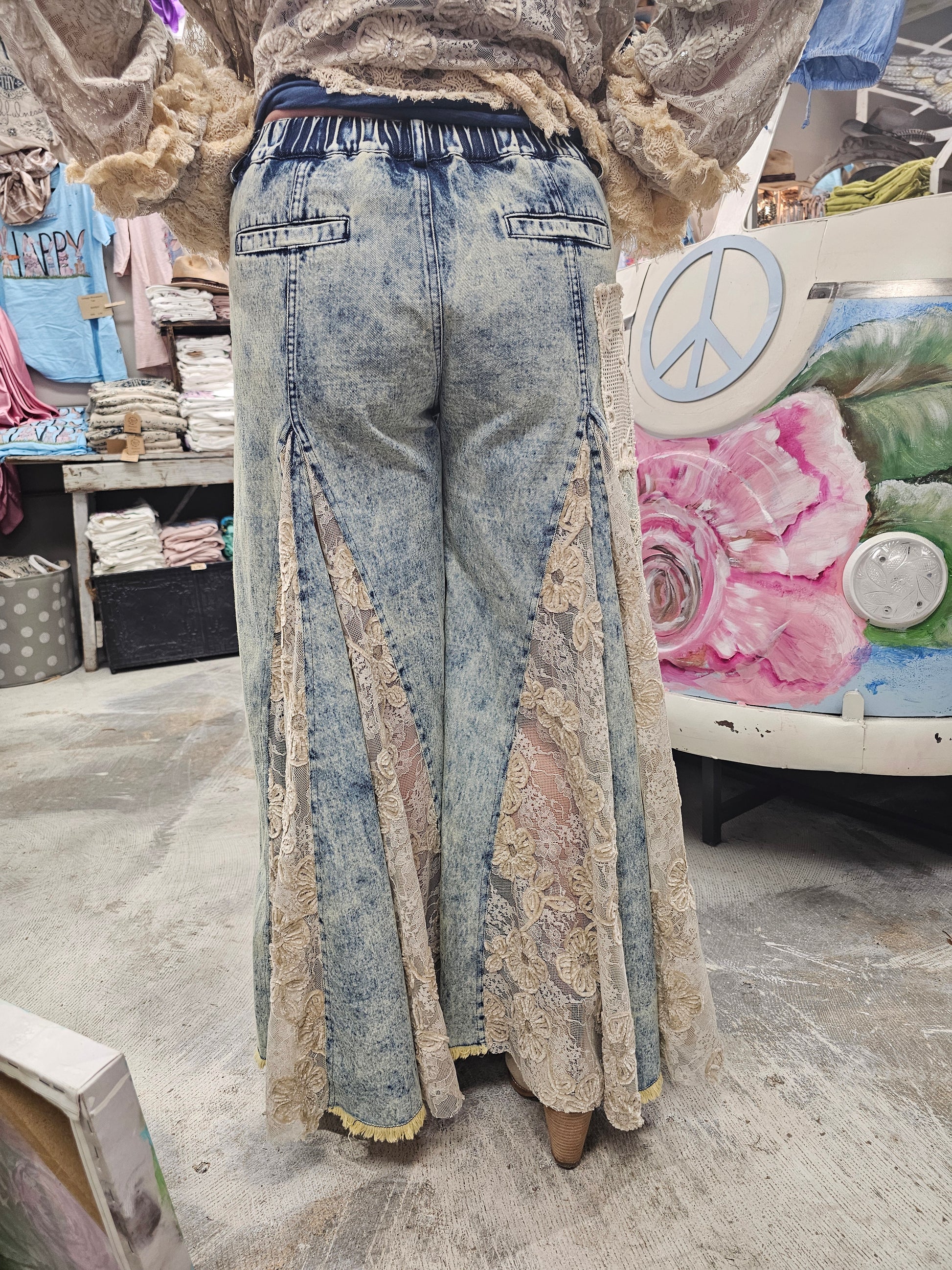 Stunning vintage jeans that have lace inset all the way around front and back. Elastic back these are a perfect fit. S, ML, XL. Small: 2-8. ML: 8-12. XL: 14-20. Don't wait on these! They will sell out!