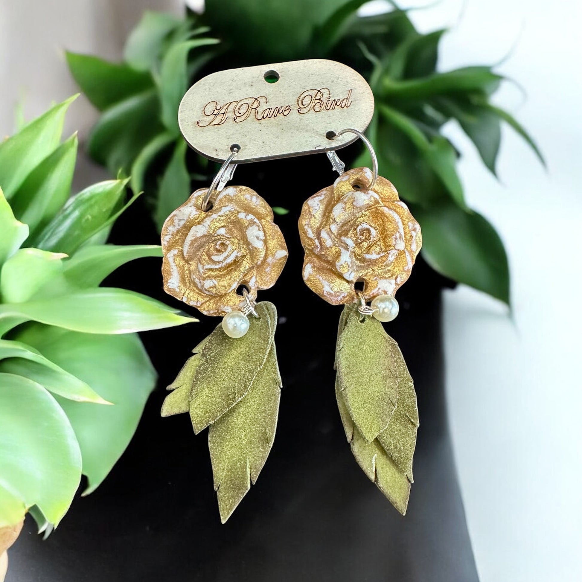 Hand carved and one of a kind, these earrings come in three colors. Pink, champagne and turquoise, Light weight with hand cut leaves dangling.