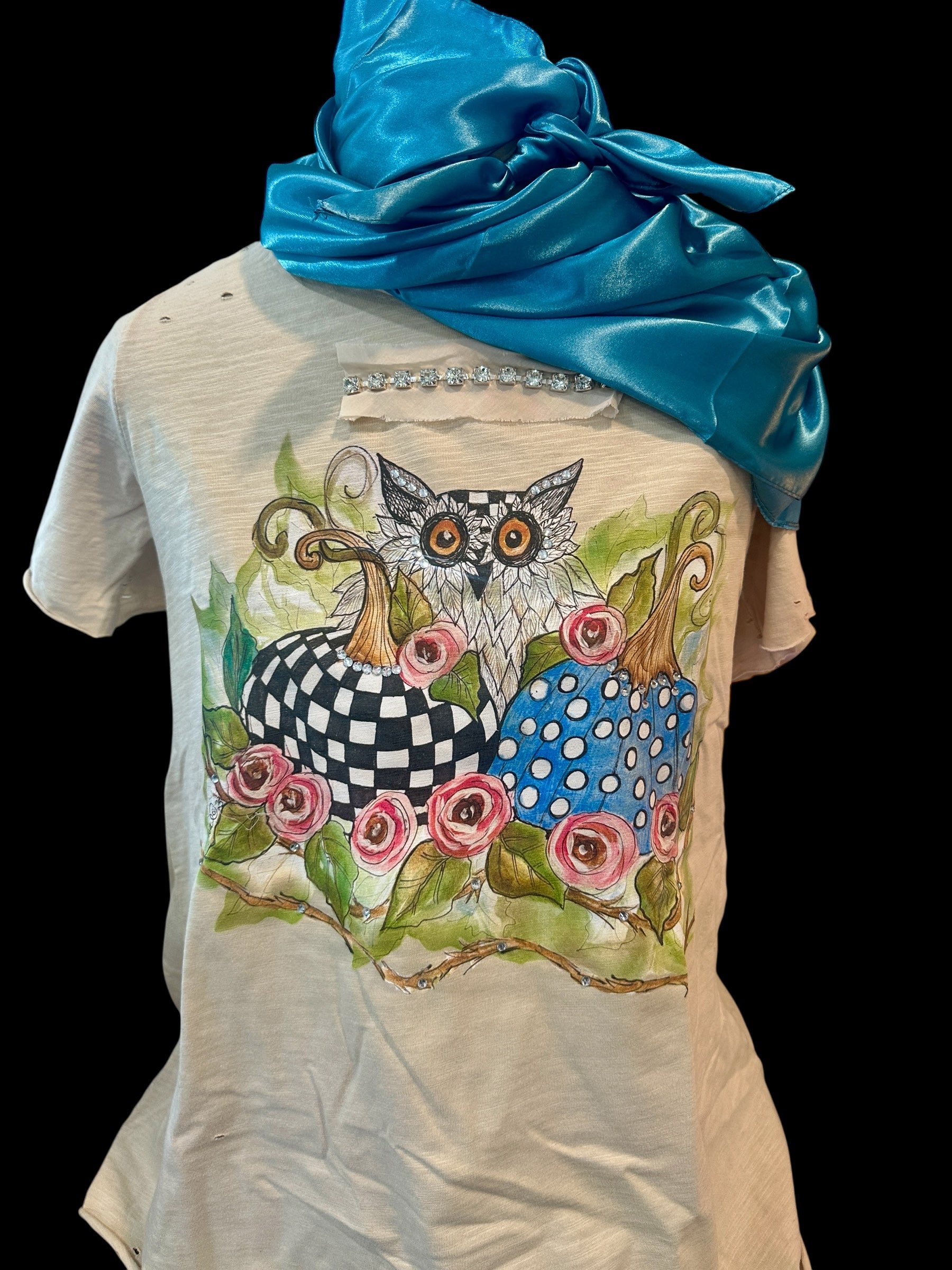 This enchanting tattered shirt is full of whimsical charm. The original art work by A RARE BIRD creates a playful yet romantic feel. Around the neckline, sparkling rhinestones catch the light, adding the perfect touch and shimmer. Adorable pumpkins and roses are painted across the front giving it the perfectly playful feel. From behind the blooms, a wise and beautiful owl peeks out---its feathers touched with dazzling sparkles.