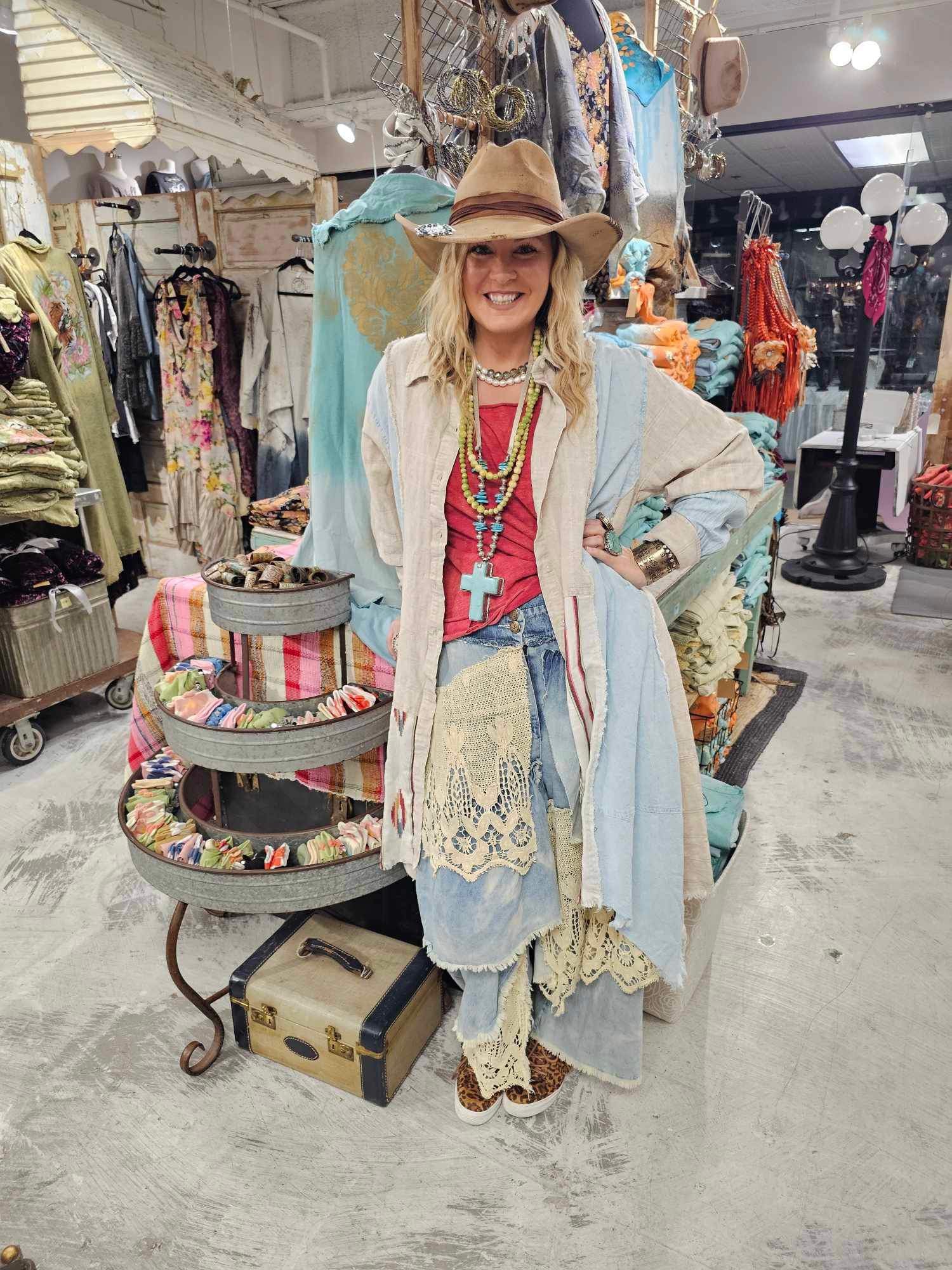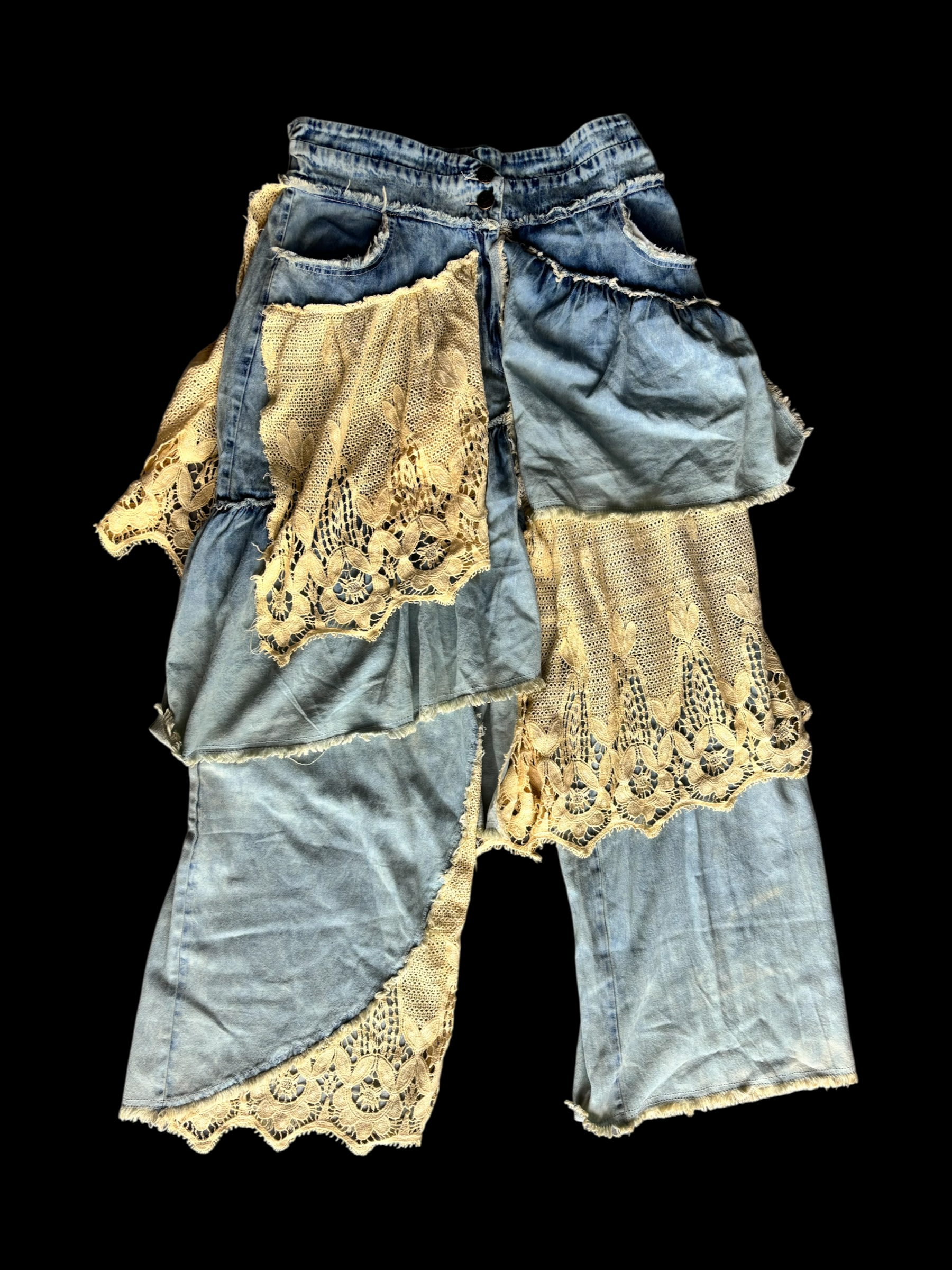 Step into whimsy with our Layered Lace Denim Jean. These jeans blend dreamy vintage lace with playful layered denim for a unique, flowy silhouette that moves with you. Available in sizes S, M/L, and XL, they bring comfort and charm to your everyday look. Perfect for adding a touch of softness to your denim collection!