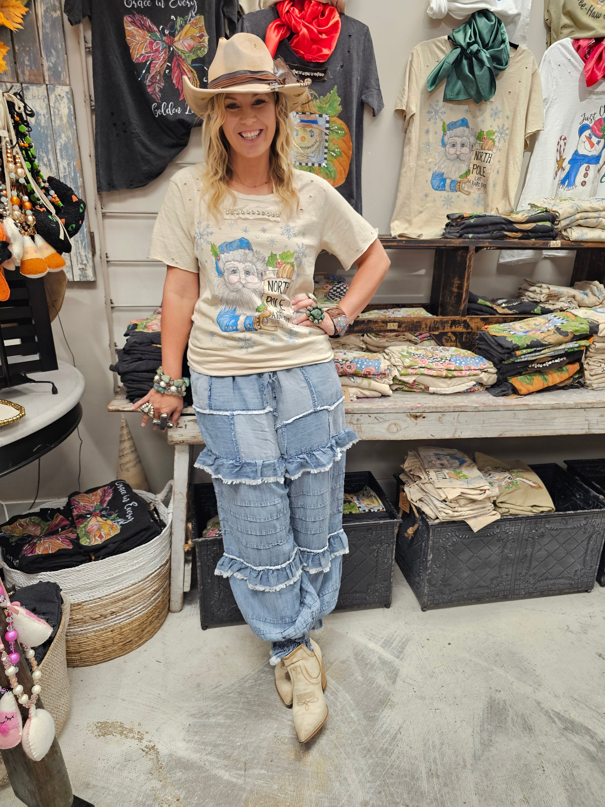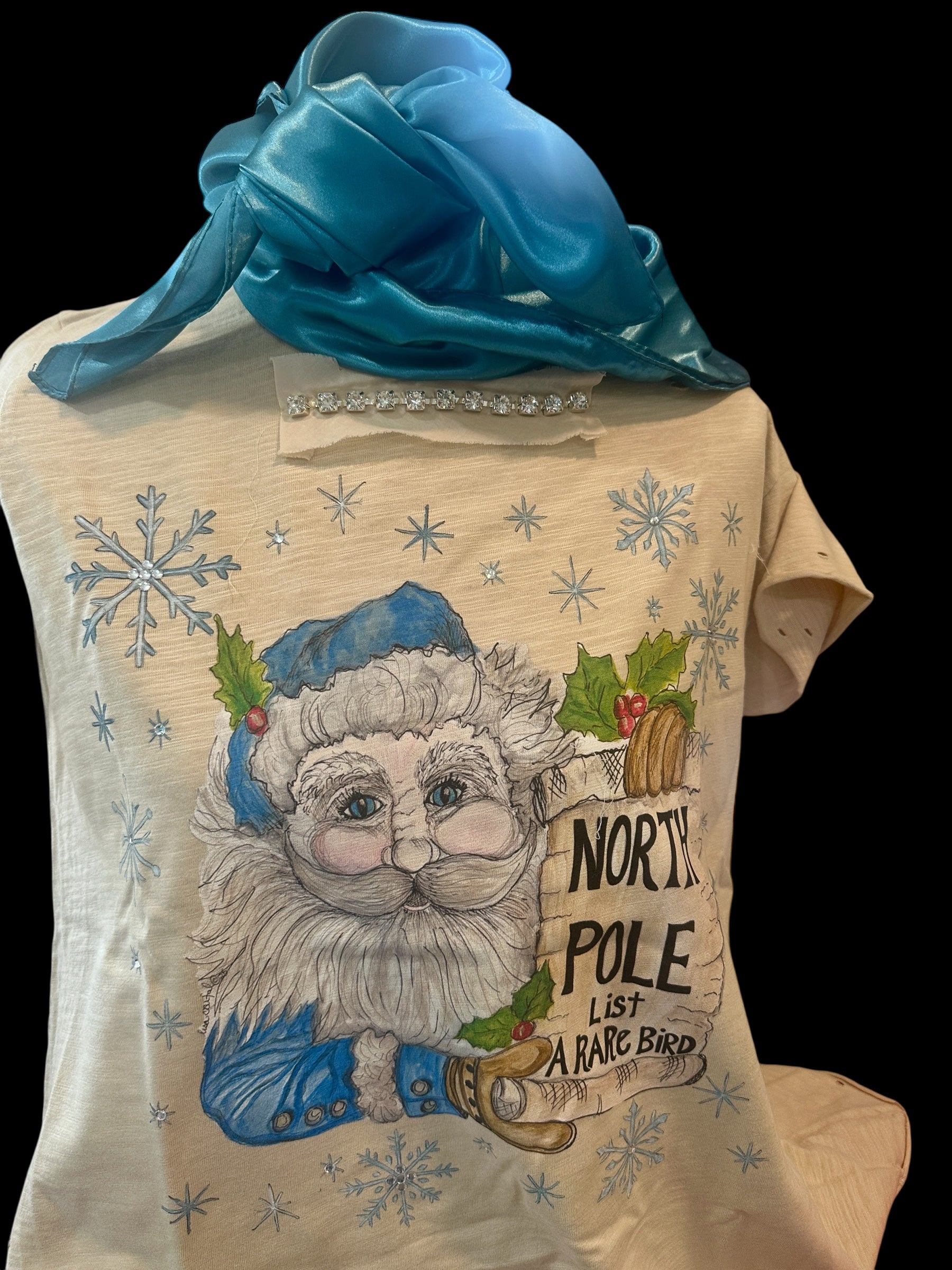 Our RARE BIRD Santa comes straight from the North Pole in shades of soft blues and vintage hues. Printed on a vintage oatmeal shirt, this whimsical Santa holds a sign that reads NORTH POLE ,while a list printed in our signature Rare Bird stands out. Snowflakes dance all around, completing the magical design. Available sm and lxl oversized fit for comfort and charm.
