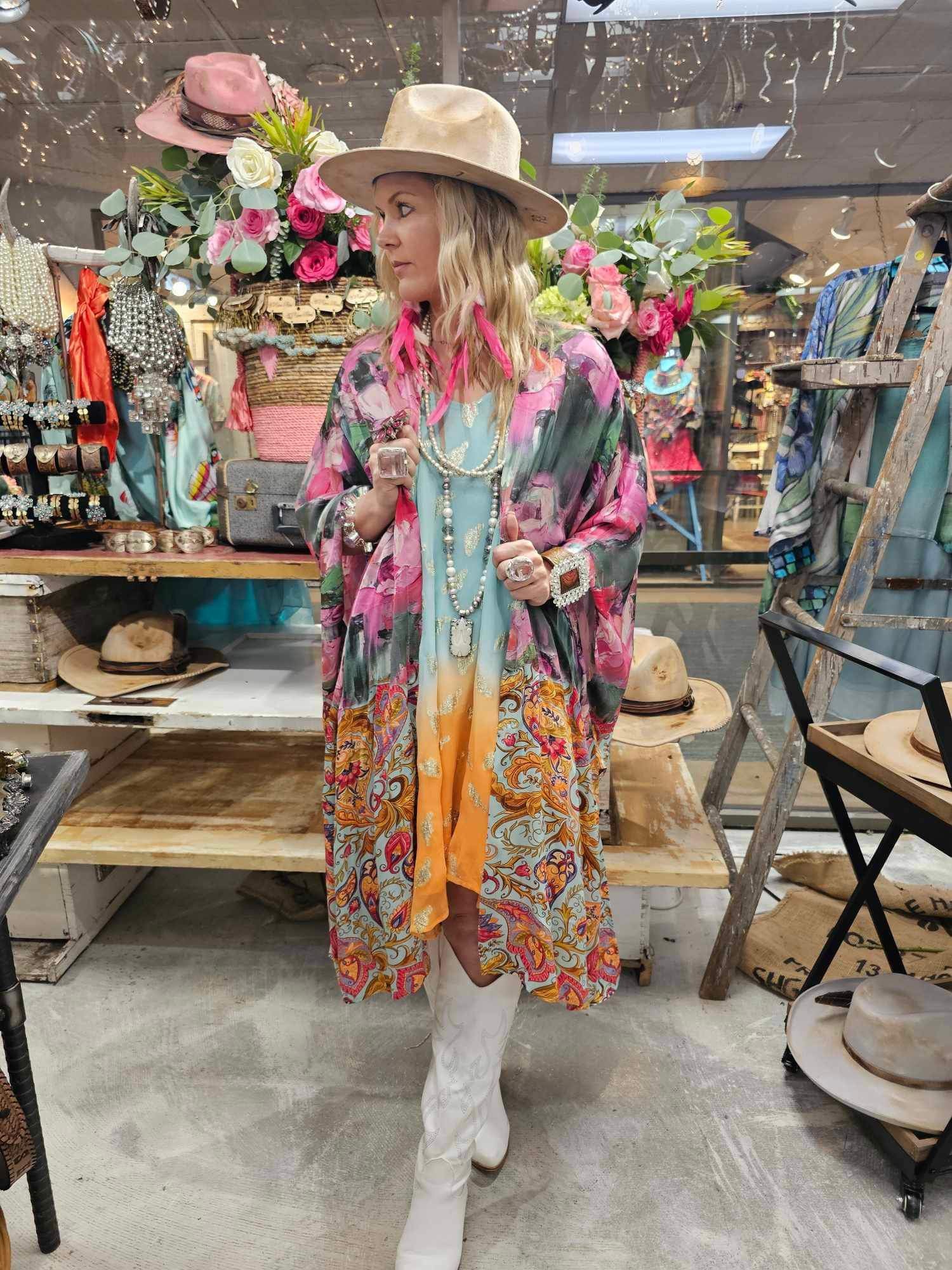 Wrap me in roses baby! This incredible satin kimono has beautiful rose garden on the top and an amazing paisley print on bottom. Slip your arms in this soft piece and wrap the long tails in a front knot, tie in the back or just leave loose. So very pretty.