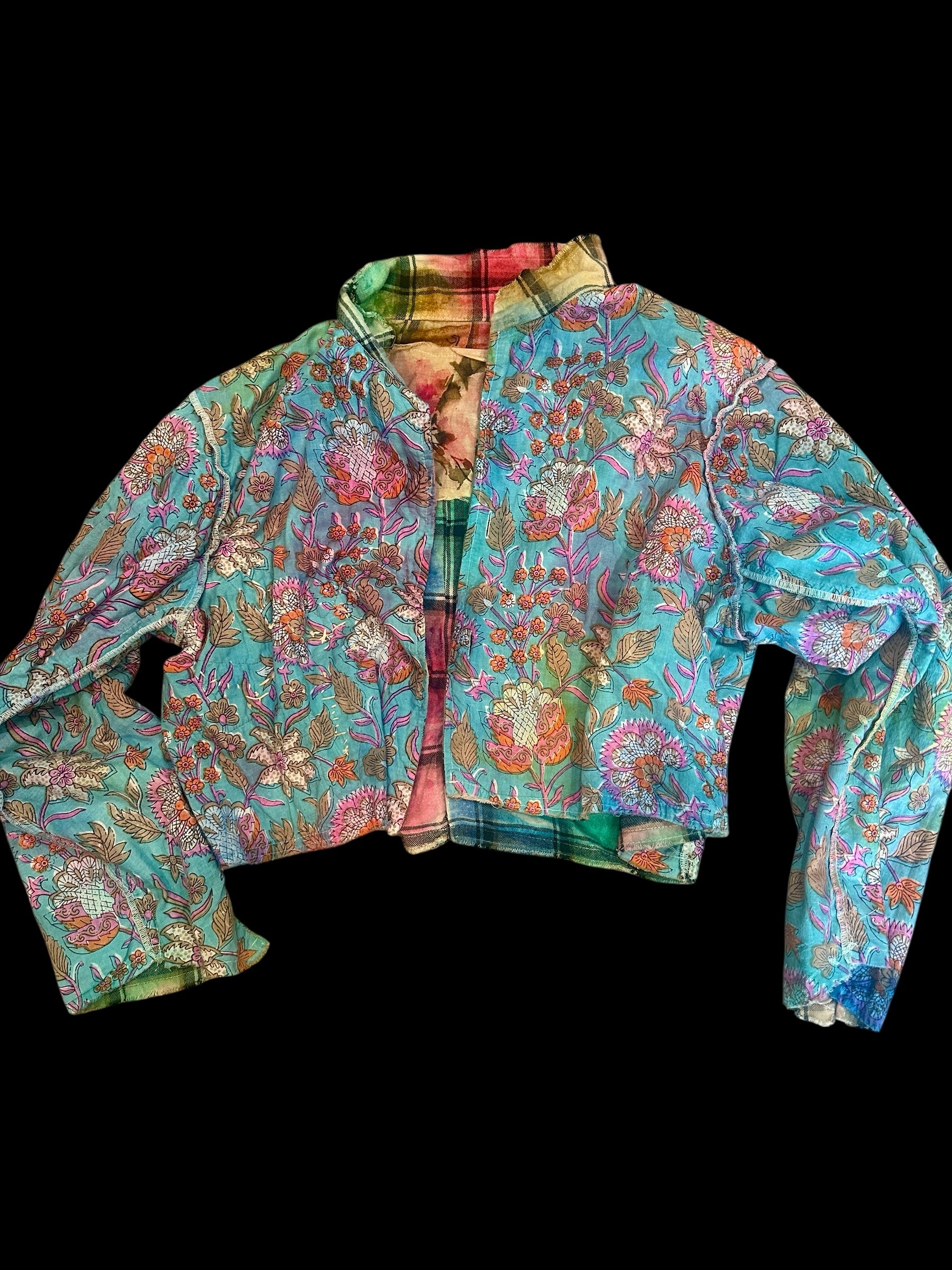 This cropped color filled flannel jacket is a wearable work of art! Featuring hand-sewn rose and bird patches that celebrate nature's beauty, it's perfect for adding personality to any outfit. The reversible design means two looks in one, flip it inside out to switch up your style. Cozy, one size, and totally one-of-a-kind.