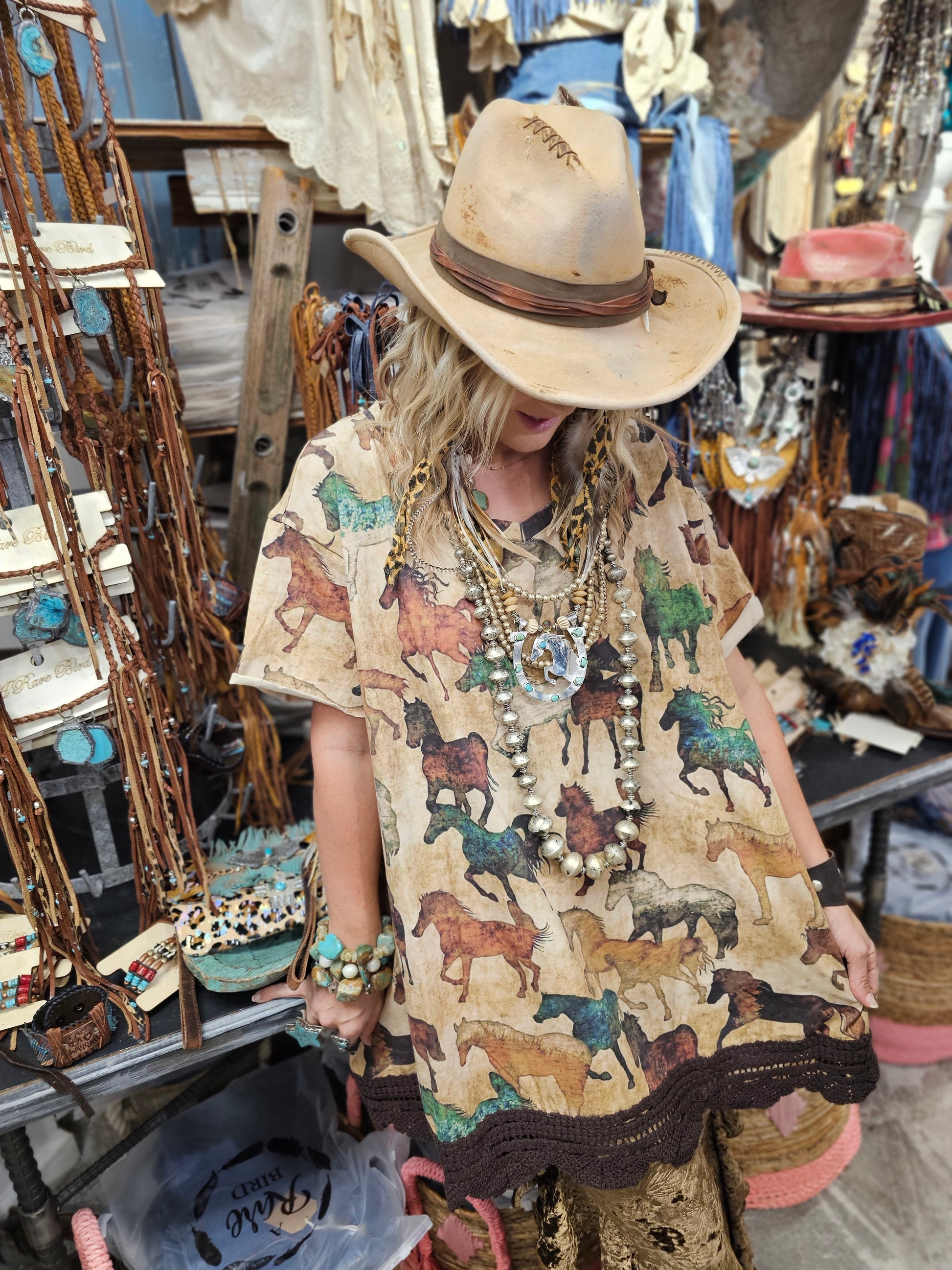 Running wild...these horses in multiple of "western colors" in tans, reds, turquoise and vintage tans. One size with gorgeous brown hand made lace on the hem. adjustable snap on one size to create and slightly tucked look if wanted. Pretty with our brown velvet butterfly leggings or black velvet leggings.