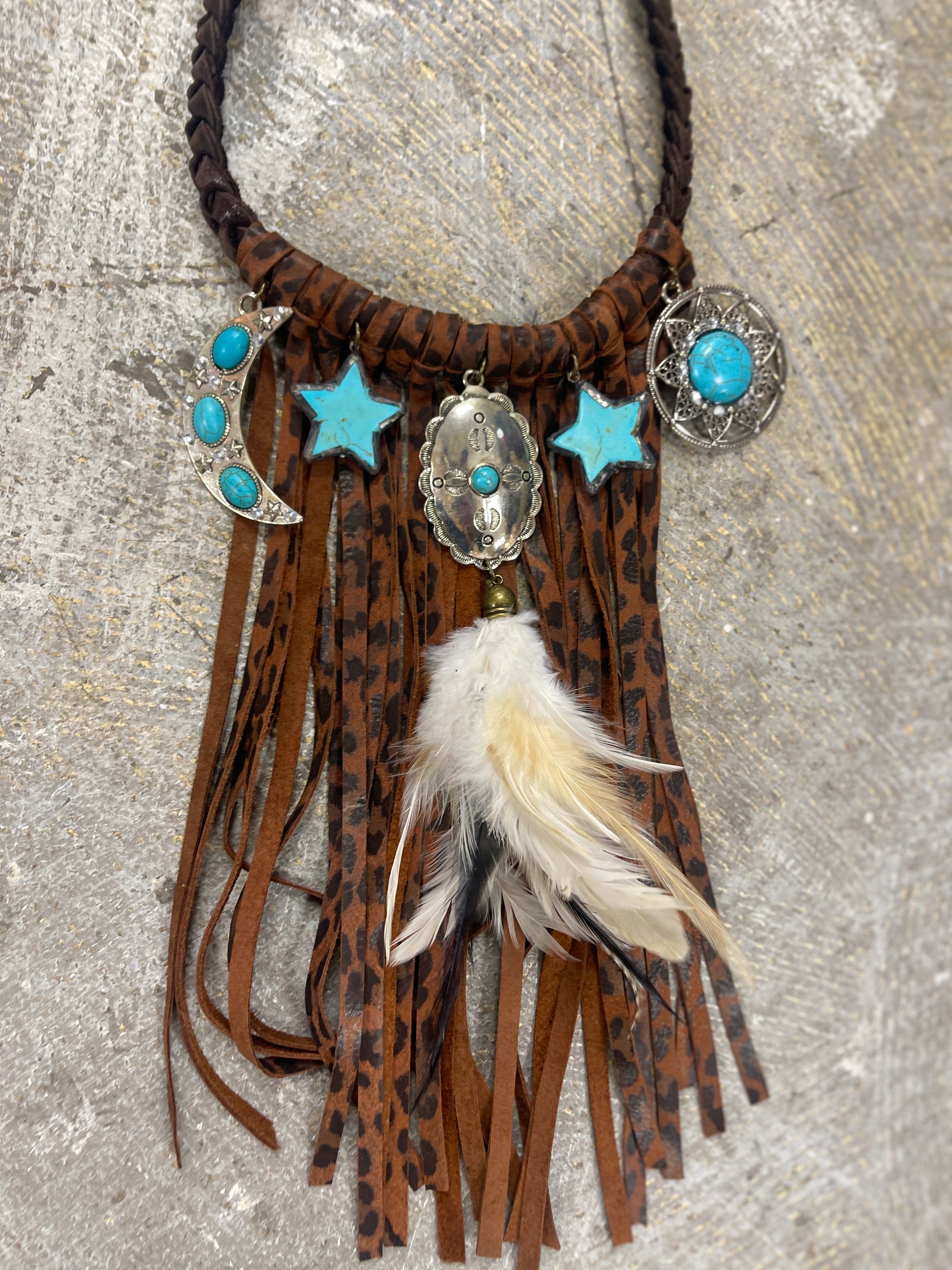 Hand braided leather makes this incredible choker/ necklace a one of a kind! Fringe and gorgeous ornaments, turquoise stars, leopard leather and feathers, create the perfect look to be worn with anything you want. Soft and comfortable adjustable leather.