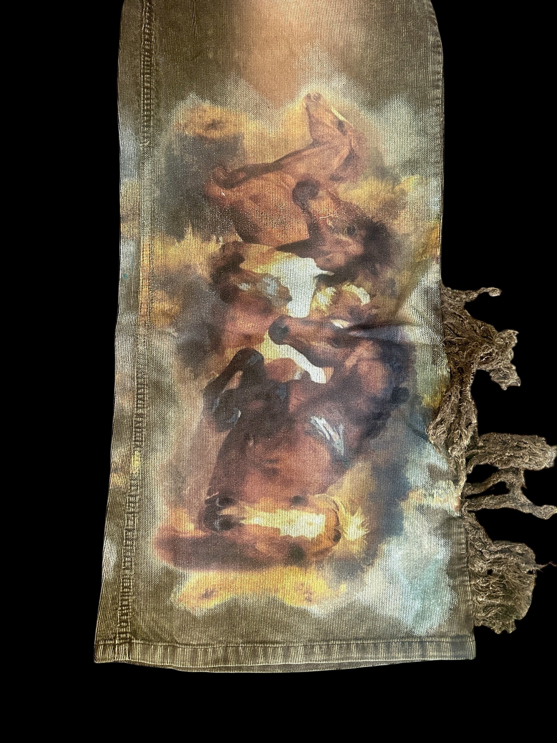 These thin waled corduroy jeans are a true statement piece, featuring breathtaking Indian artwork and powerful wild horses across the fabric. We call them our WARRIOR JEANS---a symbol of strength and freedom. Designed too pair beautifully with our Warrior Indian duster, each pair comes with a removable feather tassel attached to the waistband belt loop, adding the perfect touch of spirit and movement.